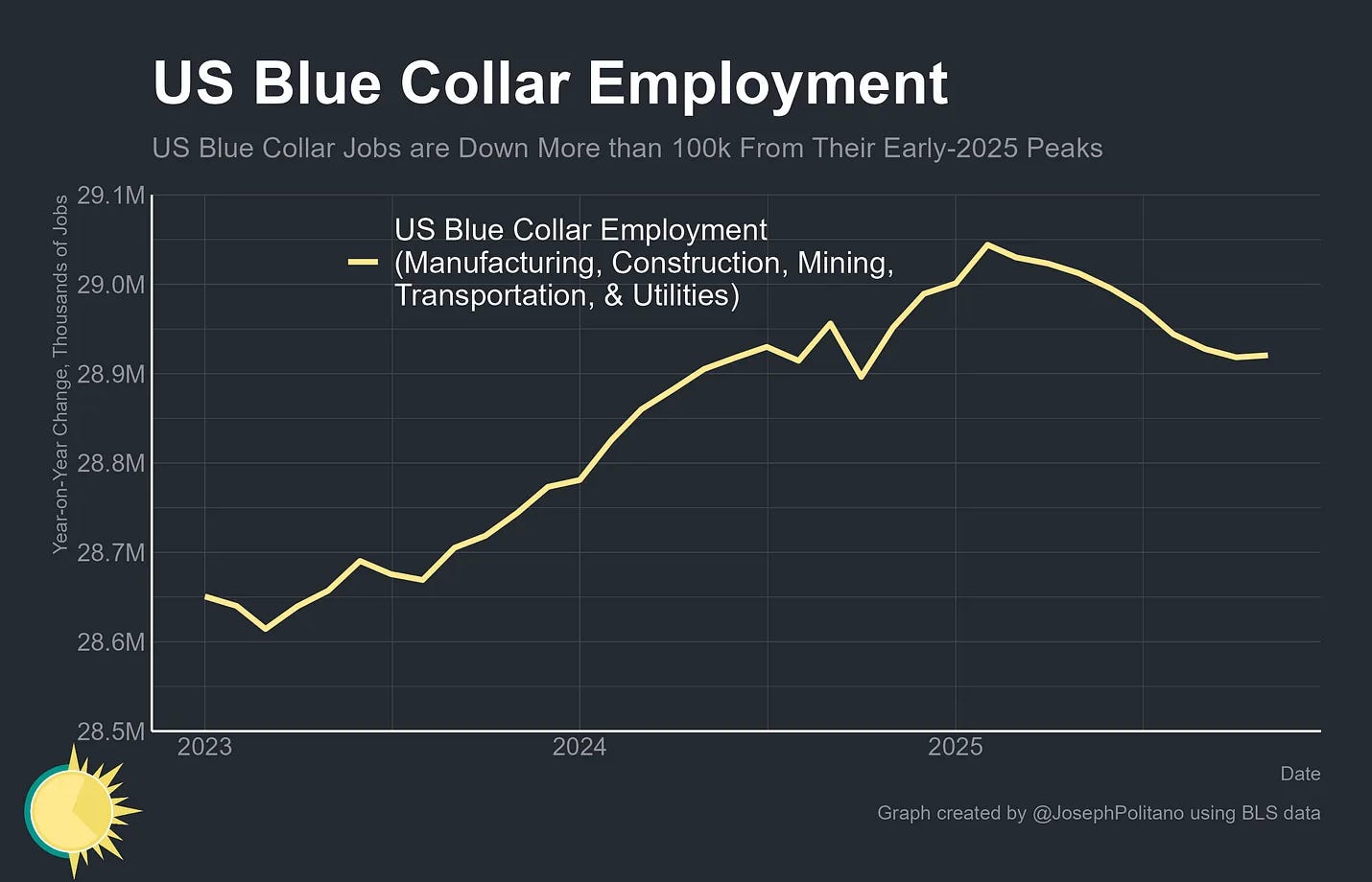 Joseph Politano explained that last year was a particularly difficult one for blue-collar workers in fields like manufacturing, mining, and warehouse work. “In total, employment across trades and industry is now down 123k from the all-time peak reached in early 2025 and has been declining nearly every month since February,” Politano writes. “This is likely underselling the damage as well, since preliminary estimates for upcoming annual jobs data revisions suggest an additional loss of 100k manufacturing jobs and 30k construction jobs.”