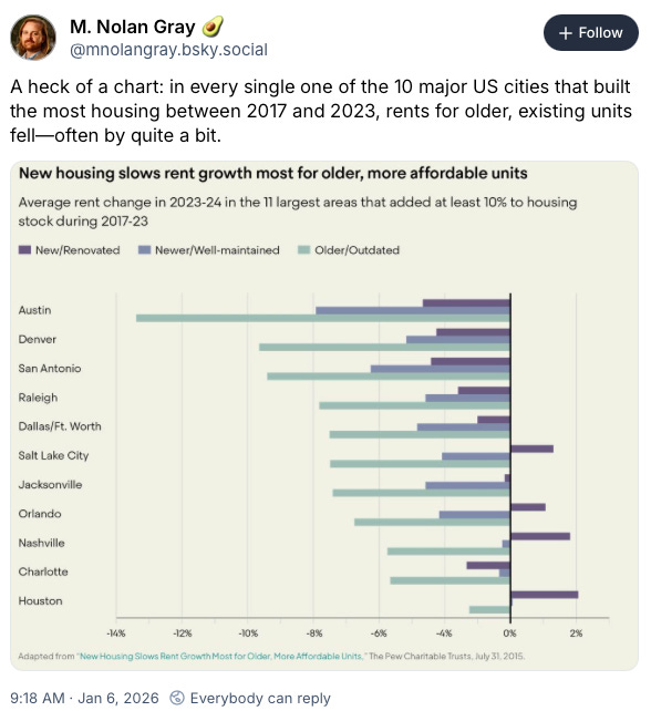 On Bluesky, M. Nolan Gray points out that we’re starting to see real evidence that, contrary to the claims of anti-growth trickle-downers, building a lot of housing drives down rents in existing housing. You can read more about this at the States Forum.
