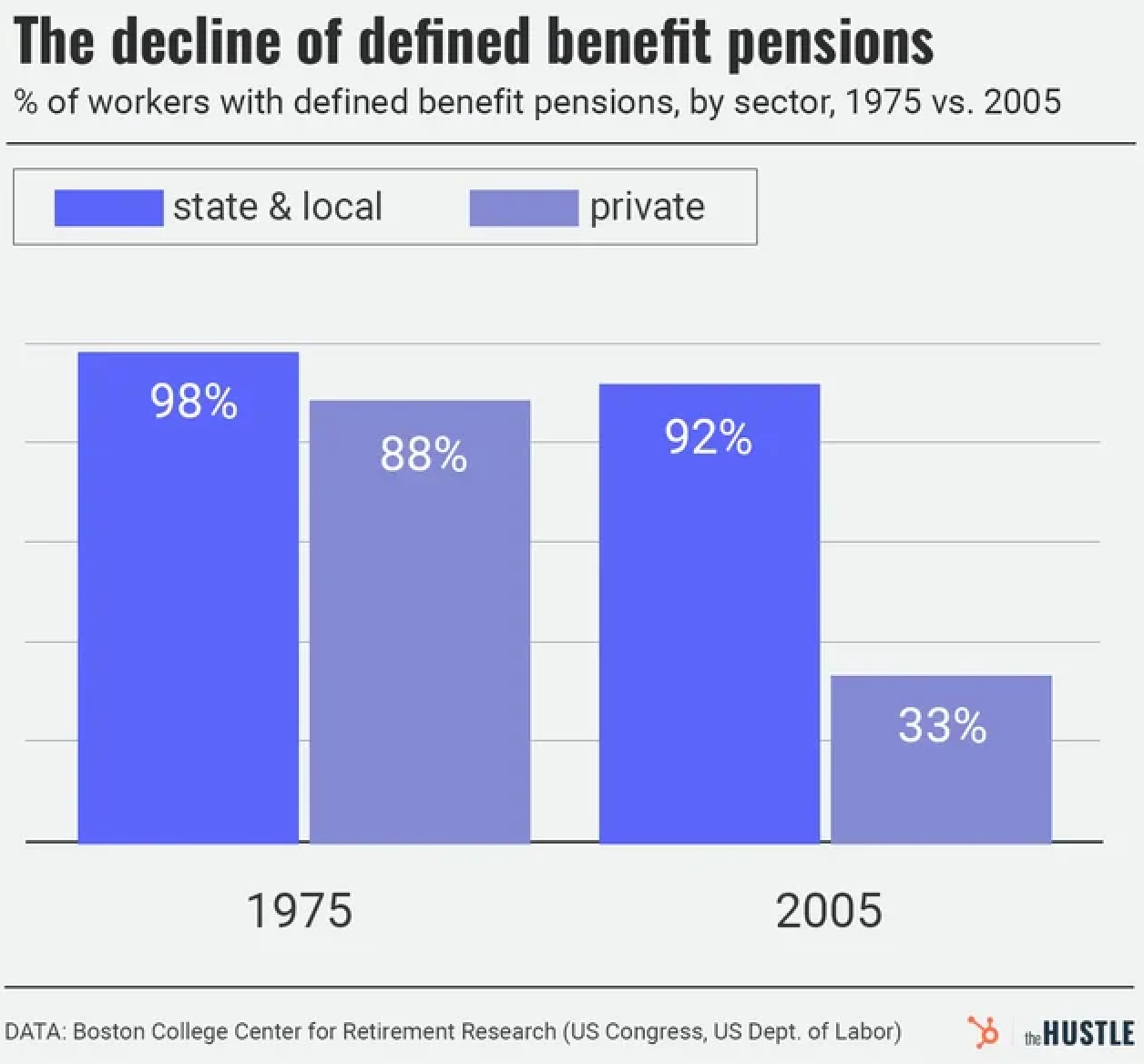 Mark Dent at The Hustle writes about the shocking decline of retirement pensions for American workers. He writes that roughly “88% of Americans employed in the private sector had defined benefit retirement pensions in 1975,” while that number has now declined to 33%. State and local governments, however, remain very strong, with 92% of workers having defined-benefit pensions.