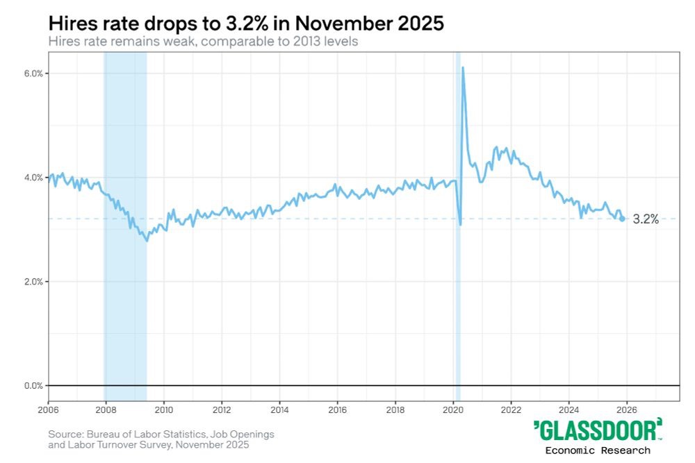 Just yesterday, we got our first bit of economic data of 2026, in the form of the Job Openings and Labor Turnover Survey (JOLTS) for November of last year. The news for workers was largely not good, with hiring numbers and job openings both declining month-over month. Glassdoor Chief Economist Daniel Zhao reports that the sluggish hiring rate now rivals “the post-Covid low, and in a similar range as seen in 2013,” when the labor market was still dragging in the slow recovery from the Great Recession.