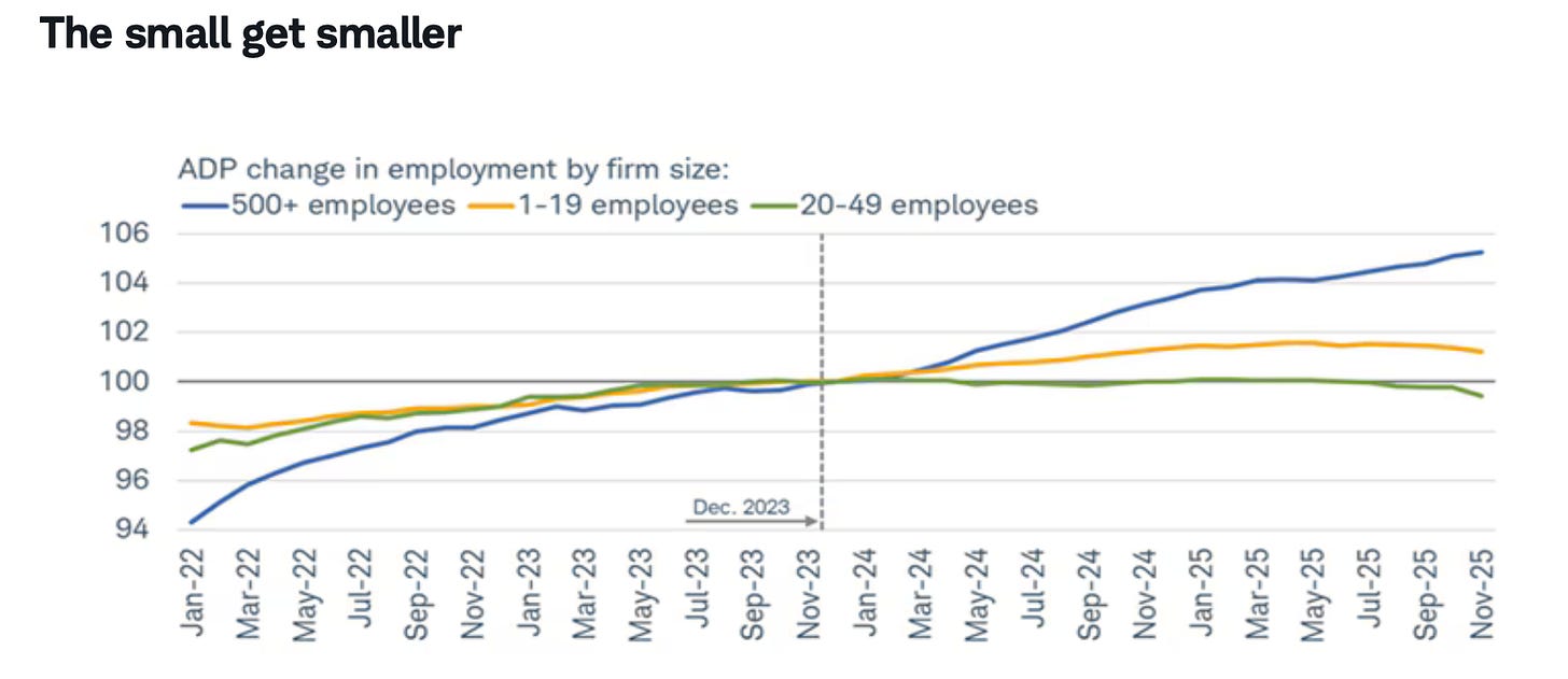 In their annual new year forecast, analysts at investment firm Charles Schwab note that the K-shaped labor market we wrote about last week is particularly harming small businesses. They write, “over the past couple of years, small businesses with 20-49 employees have seen net job losses; firms with more than 500 employees have continued to hire aggressively. For the former cohort, weakness started to accelerate this summer, presumably when businesses started to feel more of a pinch from tariffs.”